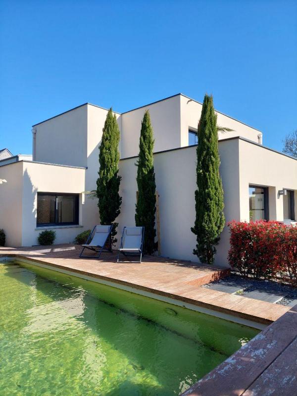 Maison moderne de 2013, avec 198 m² et une une triple exposition SUD-OUEST-EST, sans vis-à-vis. Elle offre des espaces lumineux et spacieux : Une entrée, un salon séjour de 68 m², une cuisine et arrière-cuisine, une suite parentale avec dressing et salle d’eau. A l’étage : un dégagement, deux chambres avec une salle d’eau commune, une suite parentale avec salle d’eau. Chauffage par un poêle à pellets, double vitrage, volets électriques, garage de 26 m², abri de jardin, carport. Terrasse exposée SUD, piscine avec filtration au chlore de 10m x 3 m avec volet de fermeture électrique, deux terrasses SUD et OUEST, double vitrage, VMC double flux, Aspiration centralisée. Betton , située dans la 1ere couronne à 8 kms de Rennes est une ville appréciée , reconnue et plébiscitée pour sa qualité de vie , ses espaces verts , les balades le long du canal et le grand marché du dimanche matin. Ecoles et collège . Lycée à 3 kms.